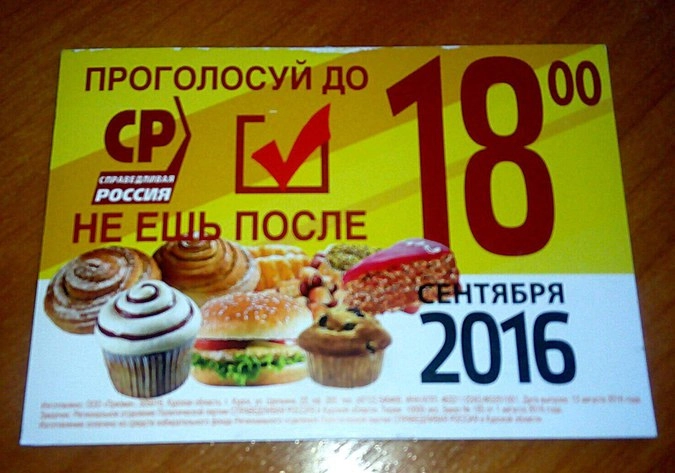 А следующая листовка «Справедливой России» сломала не один мозг обитателей «Пикабу»: «Проголосуй до шести вечера» или все-таки «проголосуй за СР — и не ешь после 18-го сентября», — спорят юзеры.