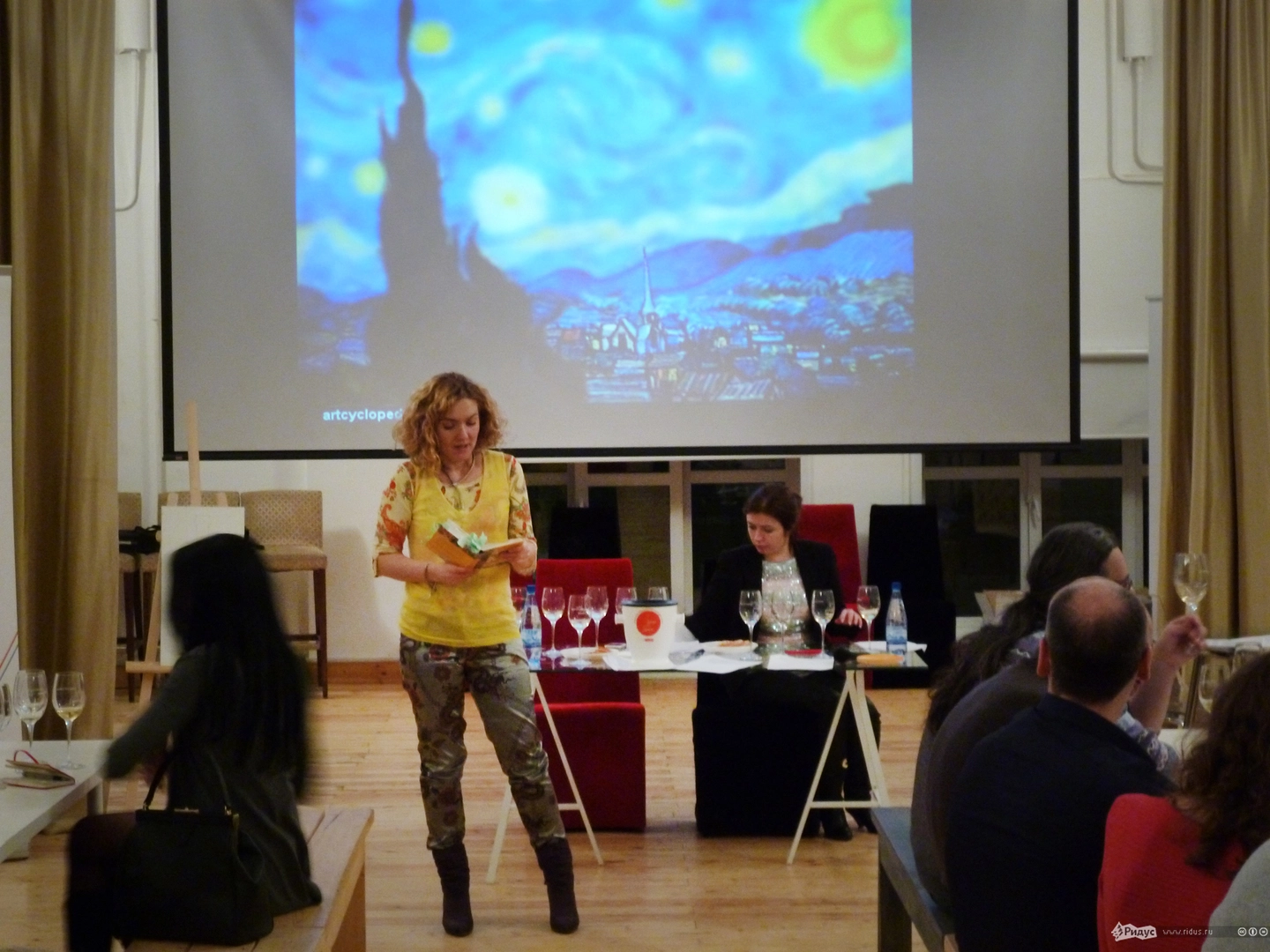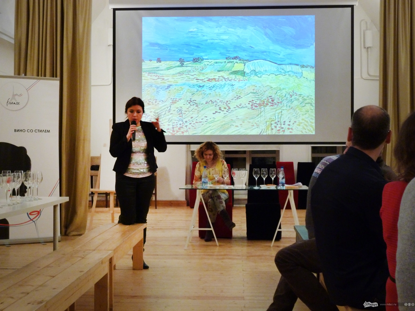 Вчерашний мастер-класс был посвящён творчеству Винсента Ван Гога и оттенкам жёлтого в его произведениях и в белом вине. Рассказ о жизни и творчестве великого художника в исполнении Екатерины Поповой чередовался с описаниями вина и замечаниями Юлианны Григорьевой. Для нее прованские пейзажи Ван Гога не просто замечательные картины, возникает впечатление, что она даже может узнать виноградники, которые там изображены. Любопытно, что для описания красок на полотнах и оттенков вина в бокале художник и сомелье использовали одни и те же слова.