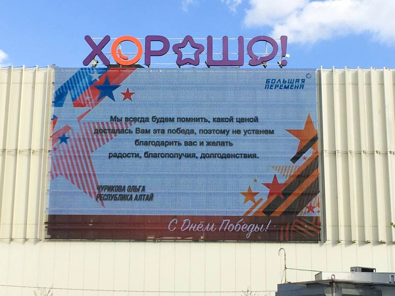 Российские школьники поблагодарили ветеранов Великой Отечественной войны за их исторический подвиг и поздравили героев с Днем Победы. Обращения участников «Российского движения школьников» и всероссийского конкурса «Большая перемена» от президентской платформы «Россия — страна возможностей» появились на огромных медиафасадах в десятке регионов страны.