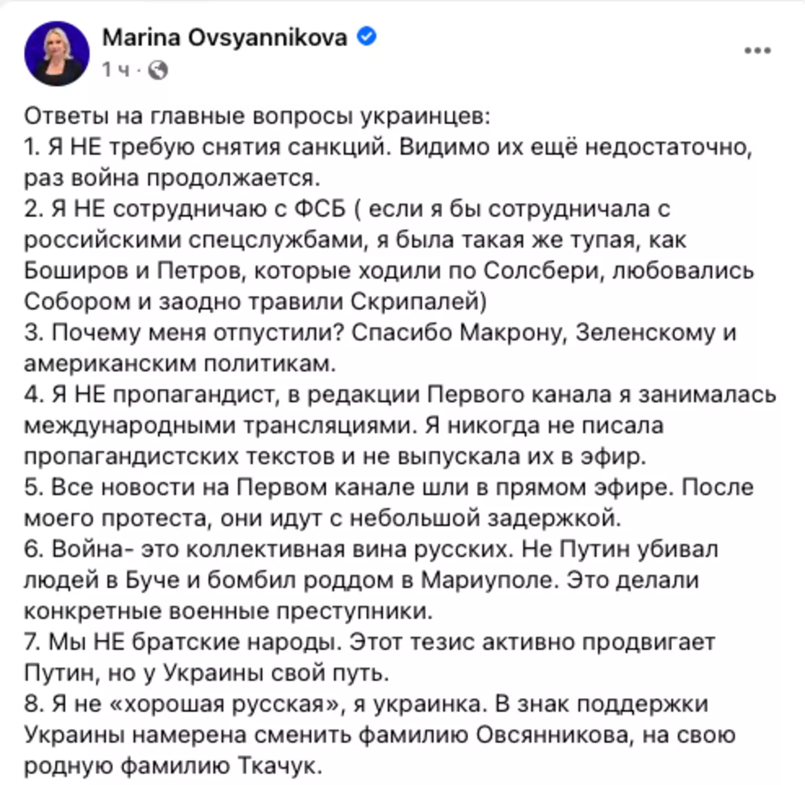 «Я не хорошая русская, я украинка. И мы не братские народы… В знак поддержки Украины намерена взять свою родную фамилию Ткачук», — указала женщина.Овсянникова поблагодарила президента Франции Эмманюэля Макрона, главу Украины Владимира Зеленского и американских политиков за то, что ее «отпустили», а не отправили в колонию. Видимо, Марина считает, что за протестную акцию на Первом канале ее должны были лишить свободы.