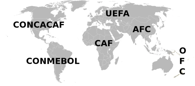 Сегодня членами ФИФА являются 209 стран, каждая из которых принадлежит к той или иной из шести континентальных конфедераций: УЕФА (Европа), АФК (Азия и Австралия), КАФ (Африка), КОНКАКАФ (Северная и Центральная Америка, а также страны Карибского бассейна), КОНМЕБОЛ (Южная Америка), ОФК (Океания). В ряде случаев есть свои нюансы, так что не всегда географическое положение определяет принадлежность к той или иной конфедерации. К примеру, Израиль, из-за многолетнего бойкота ближневосточных соседей, числится в УЕФА и выступает на Чемпионатах Европы, а Австралия слишком сильна для коллег по Океании, поэтому с 2006 года принадлежит к АФК.