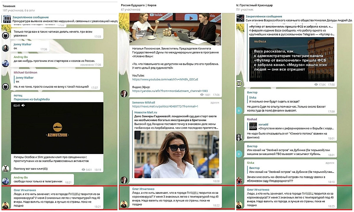 С коронавирусом, похоже, повторяется та же история — в региональных вотсапах и телеграме массово рассылаются однотипные сообщения о заболевших коронавирусом. Но кто же их авторы?Юрист представил ряд скриншотов из чатов в Telegram и WhatsApp: некто Олег Игнатенко в сообществах Тюмени, Томска, Магнитогорска и Краснодара оставил идентичные сообщения о том, что из России пора бежать.