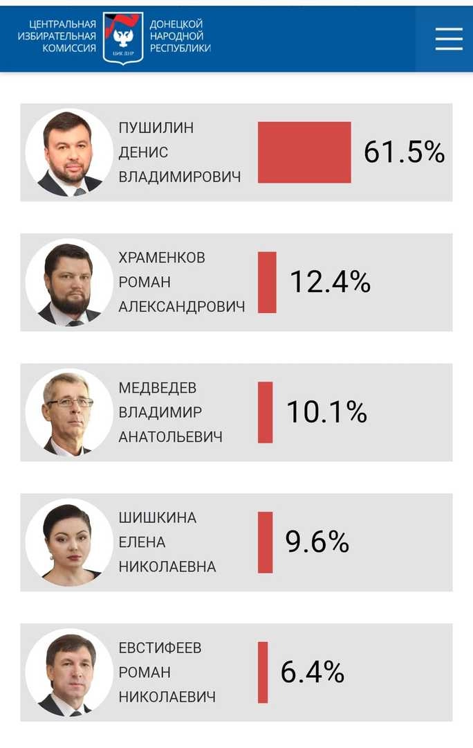 В Донецке Пушилин также лидирует с большим отрывом. Но если у Пасечника изначально не было соперников — его кандидатура устраивала все политические силы ЛНР, — то в случае с Пушилиным ситуация была сложнее. Серьезную конкуренцию ему могли составить бывший министр доходов и сборов ДНР Александр Тимофеев (Ташкент), экс-командир батальона «Восток» Александр Ходаковский и бывший «народный губернатор» Павел Губарев.