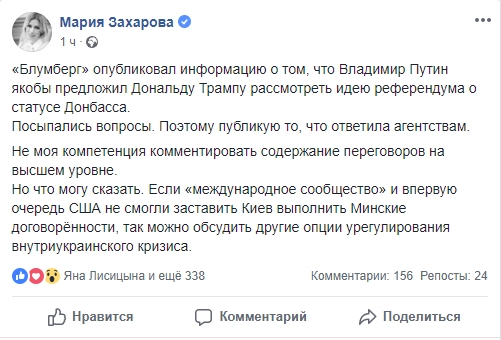 «Если „международное сообщество“, и в первую очередь США, не смогли заставить Киев выполнить минские договоренности, так можно обсудить другие опции урегулирования внутриукраинского кризиса», — написала Захарова в Facebook.