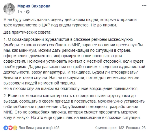 Позже официальный представитель МИД написала еще один пост. Дипломат усомнилась, что журналисты собирались делать расследование о работе ЧВК.