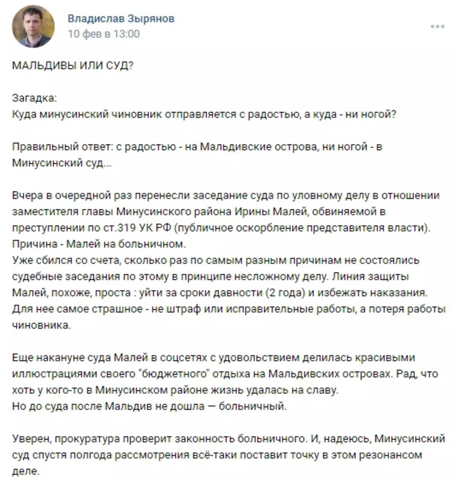 «В Минусинске вынесен приговор в отношении заместителя главы района за публичное оскорбление представителя власти. Суд с учетом позиции государственного обвинителя назначил женщине наказание в виде штрафа в размере 25 тысяч рублей, частично удовлетворил иск потерпевшего о взыскании морального вреда», — передает пресс-служба прокуратуры.Инцидент, который кончился для Ирины Малей штрафом, произошёл в сентябре 2020 года, когда Зырянов выступил с критикой администрации Минусинского района. По данным РИА ФАН, после этого замглавы администрации пририсовала на информационном стенде мужской половой орган к тому месту, где на фотографии депутата был изображен рот, и сделала непристойную приписку к имени Владислава Зырянова. Публикация об этом появилась в аккаунте минусинской администрации.