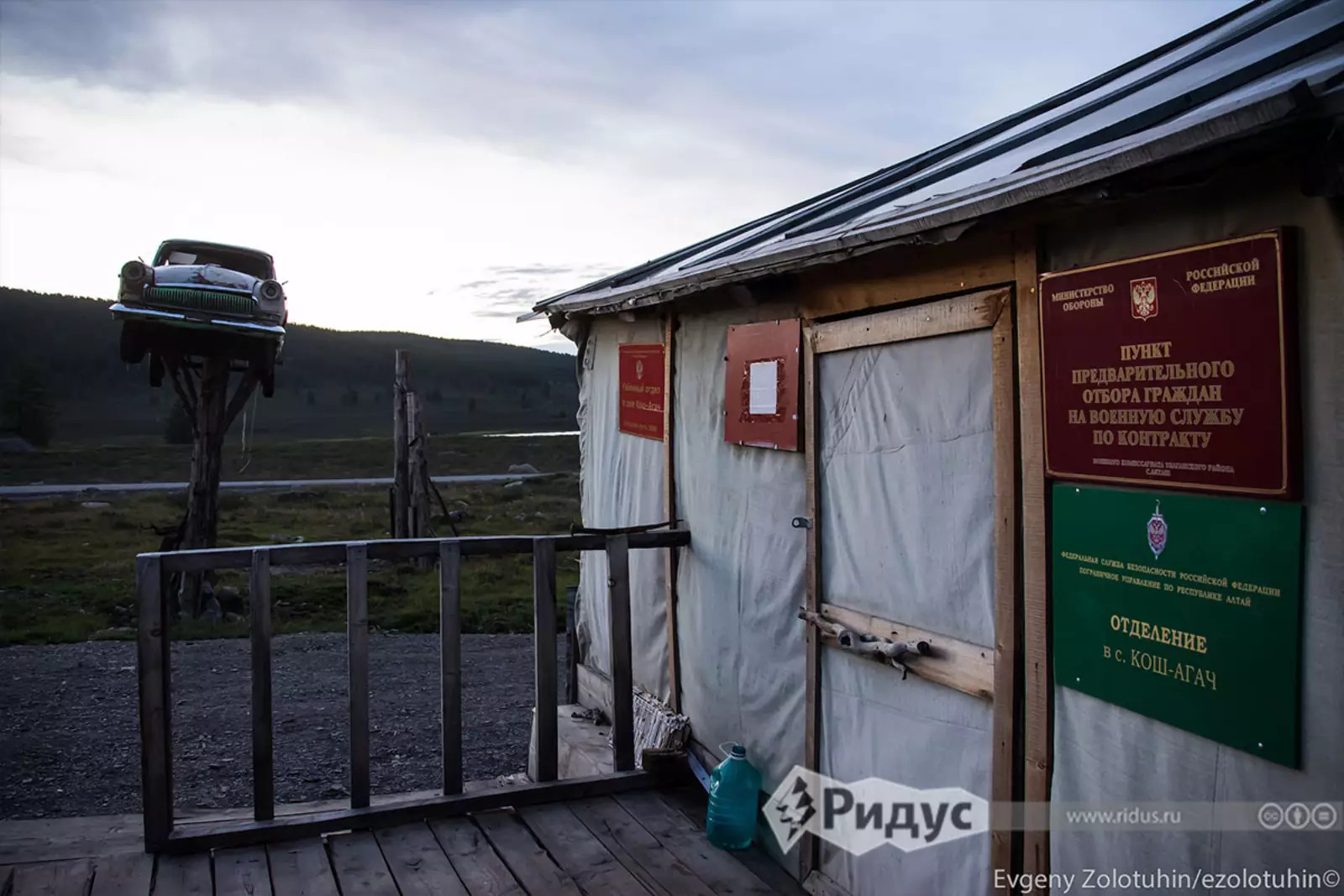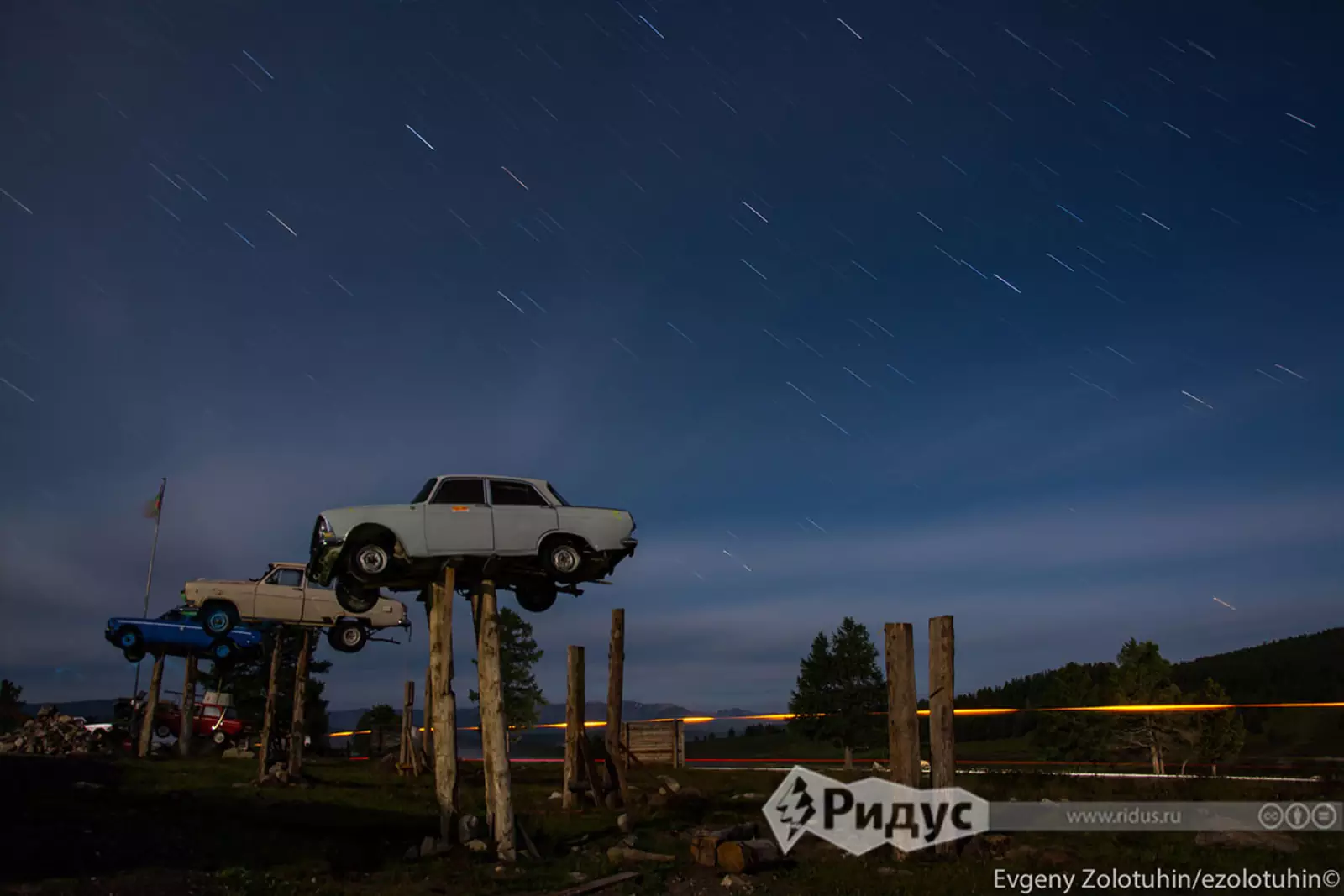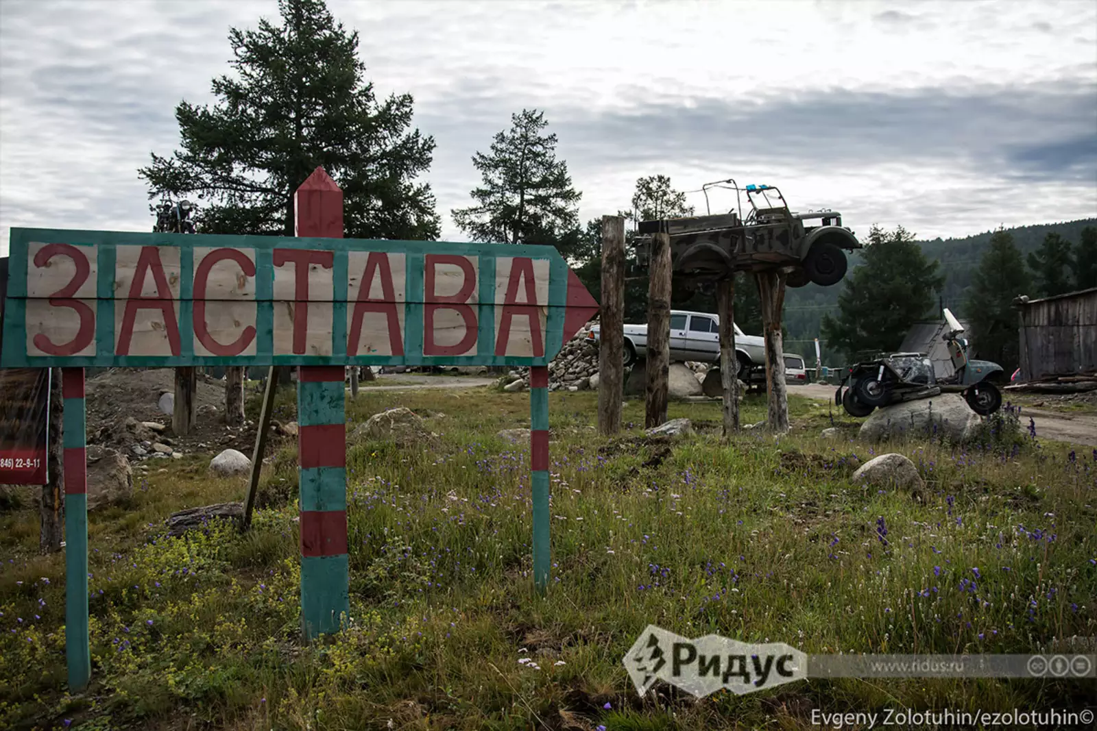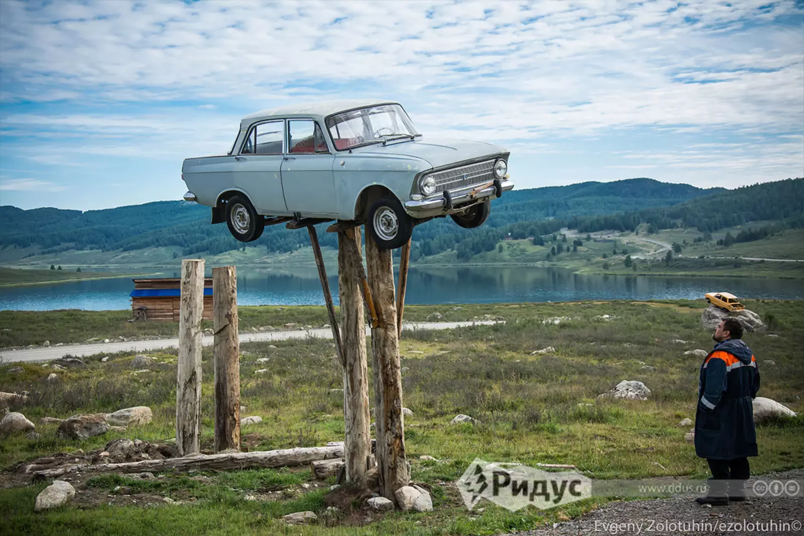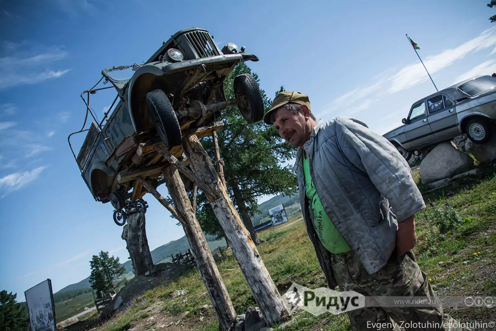 Не остановиться и проехать мимо просто невозможно. Свою турбазу бывший прапорщик построил в очень живописном месте в двадцати километрах от села Акташ. Со всех сторон горы, озера и невероятной красоты алтайские пустоты. И вот среди всей этой красоты на не самой хорошей алтайской дороге внезапно появляются огромные деревянные столбы и камни, на которые взгромождены старые советские автомобили.