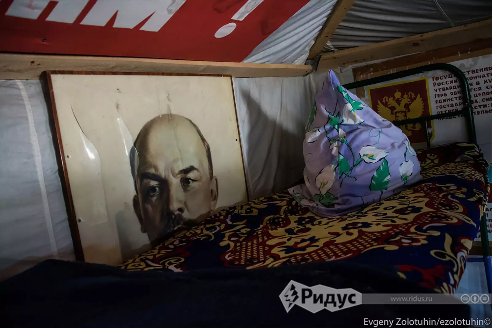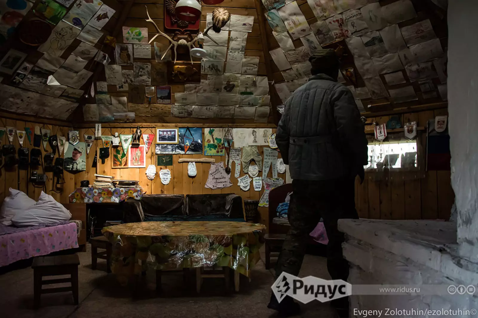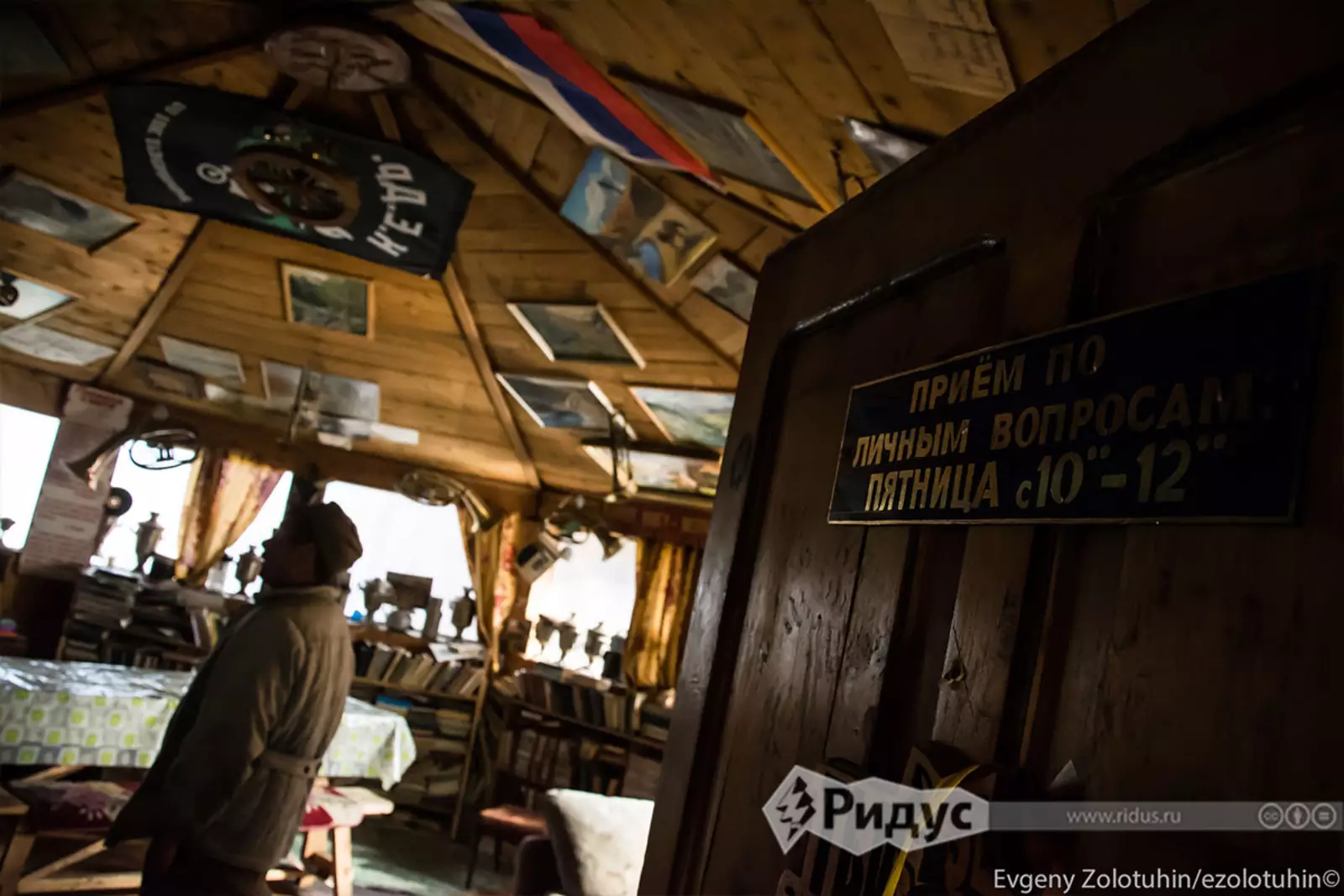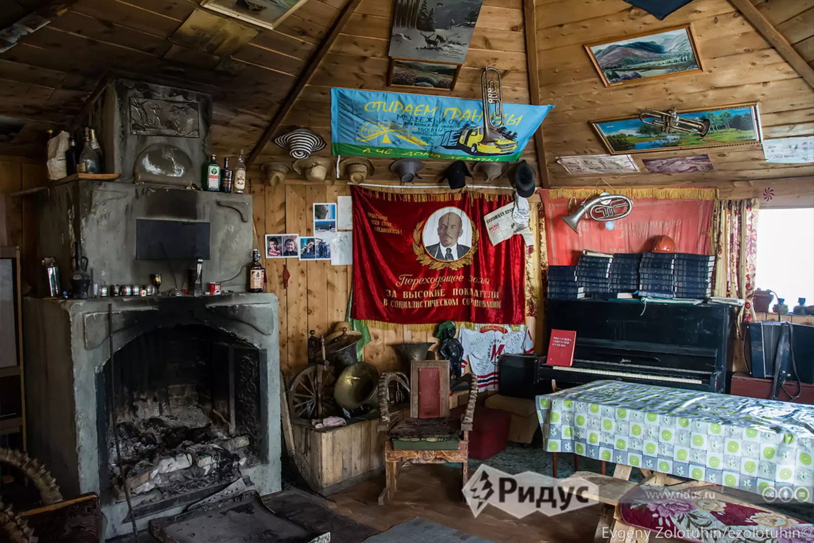 И это не единственный дом-музей на турбазе. Музей на базе Валентина буквально в каждом доме и даже в туалете. Все, что осталось брошенным военными в закрытой военной части, Михалыч увез себе, включая флаг пограничников, знамена и кучу всего остального, — все это стало частью экспозиции его гостевых домов.