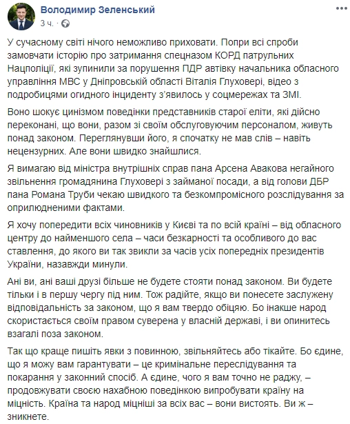 Президент Украины Владимир Зеленский потребовал немедленного увольнения главы Национальной полиции Днепропетровской области генерала Виталия Глуховери, о чем написал на своей странице в Facebook.