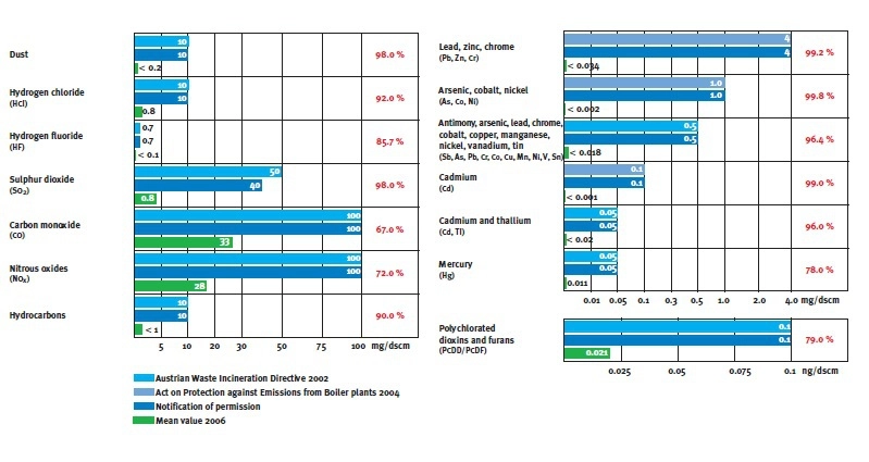 Выбросы МСЗ последнего поколения, к которому относится «Шпиттелау», в большинстве случаев значительно ниже допустимых норм, диктуемых строгими европейскими и муниципальными законами. «Есть предусмотренные законом нормы по выбросам, мы выдаем выброс на 90% чище, чем они предусматривают», — говорит Бареш.