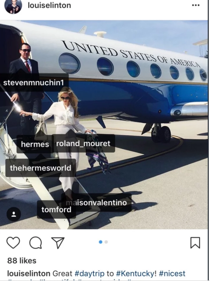 Луиз Линтон опубликовала снимок с мужем на трапе самолета. На фото она отметила аккаунты известных брендов, наряды и аксессуары которых она выбрала для выхода в свет. Таким образом, она прорекламировала марки Hermes, Tom Ford, Valentino, Roland Mouret.