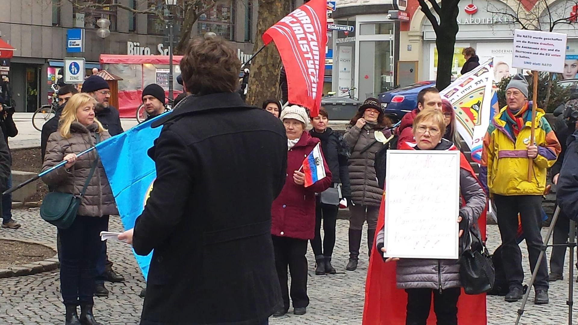 На центральных улицах Мюнхена собрались несколько сотен представителей антифашистских и антиглобалистких движений со всего мира. Собравшиеся потребовали от НАТО прекратить агрессивную политику против России и нагнетание антироссийской истерии в СМИ.