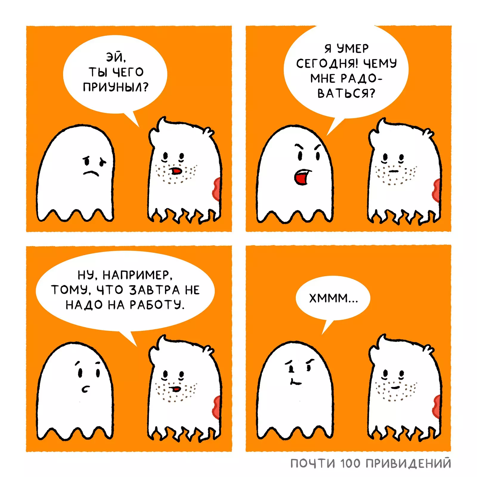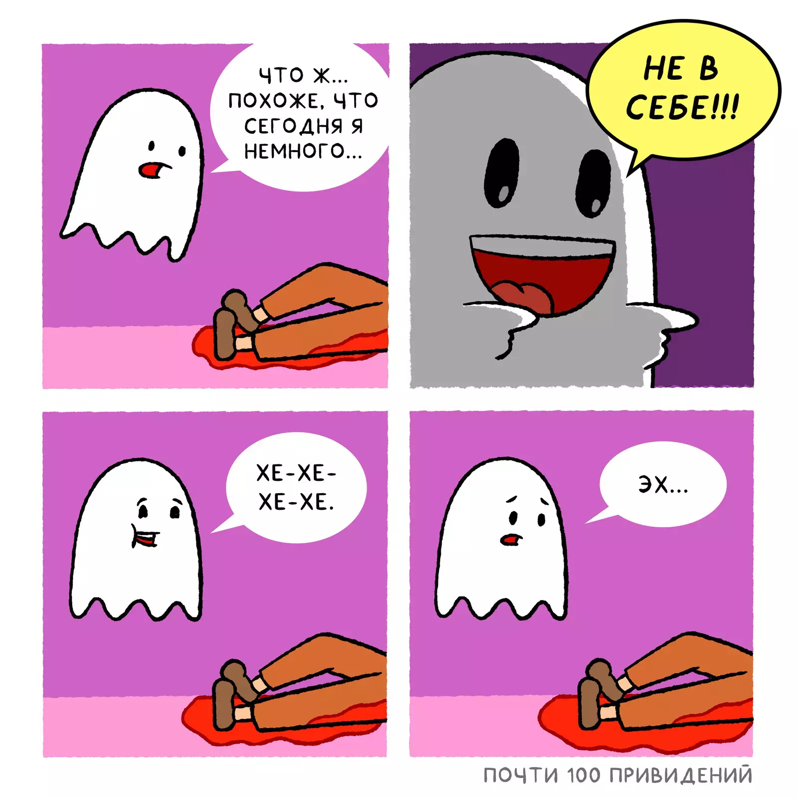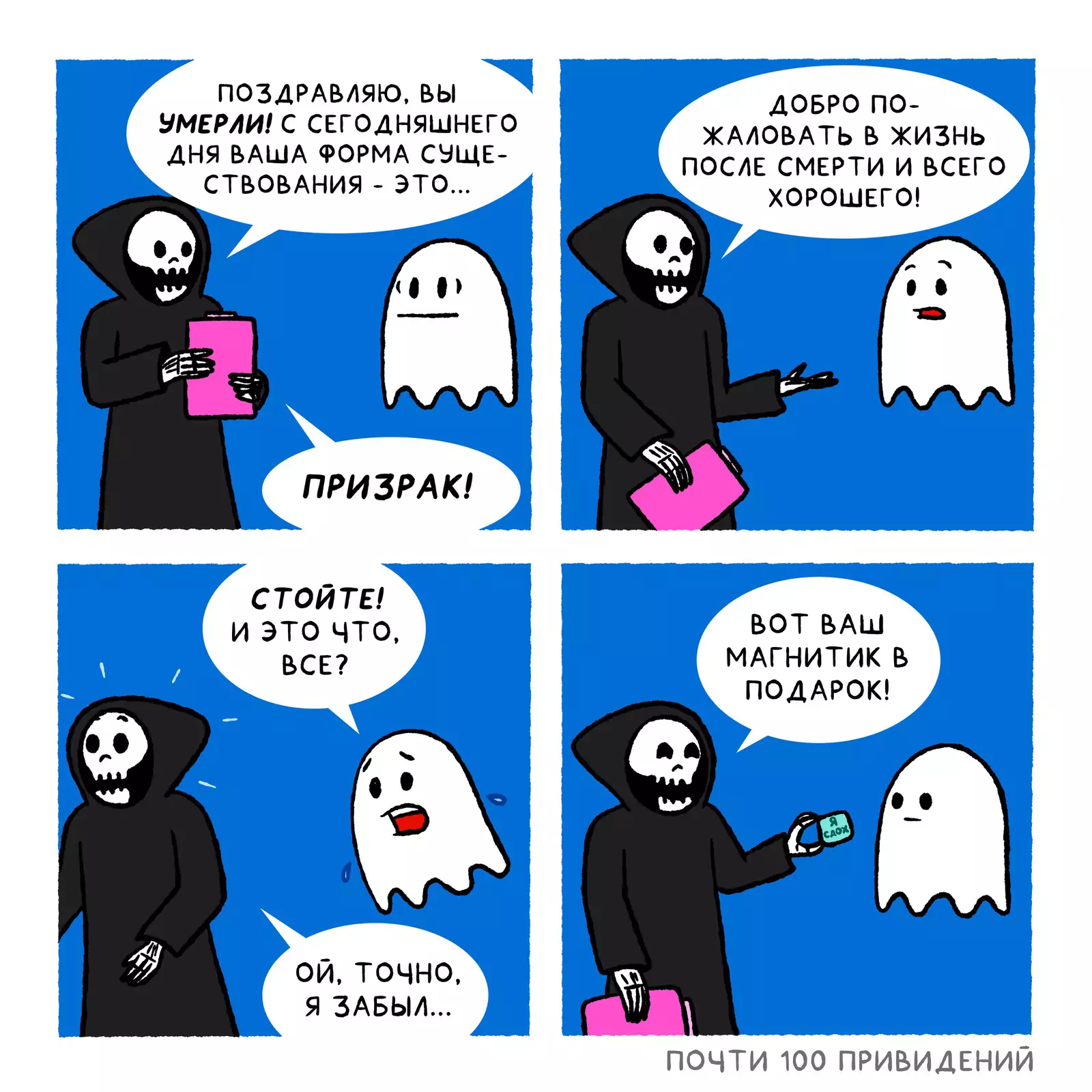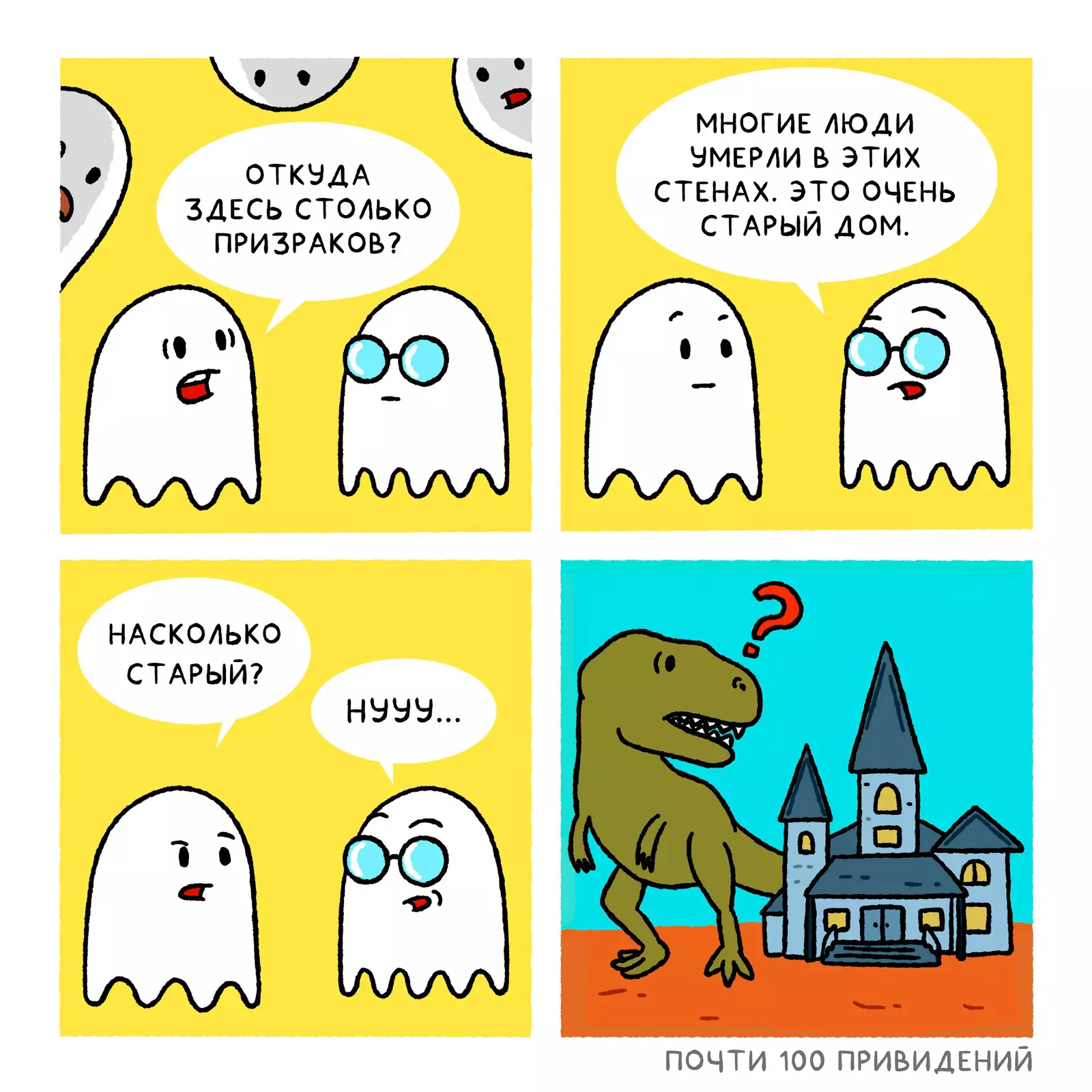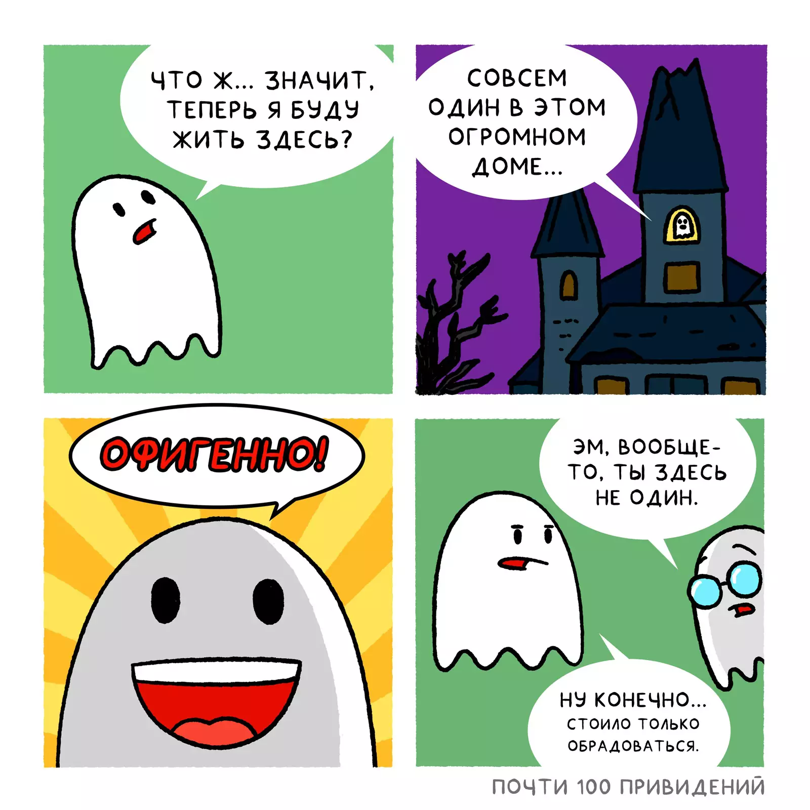 Комиксы серии «Почти 100 привидений» — история о старинном доме и множестве душ, которые не могут обрести покой. Они спокойно себе живут, общаются и сталкиваются с проблемами, знакомыми каждому. Предлагаем вам оценить рисунки Павла.