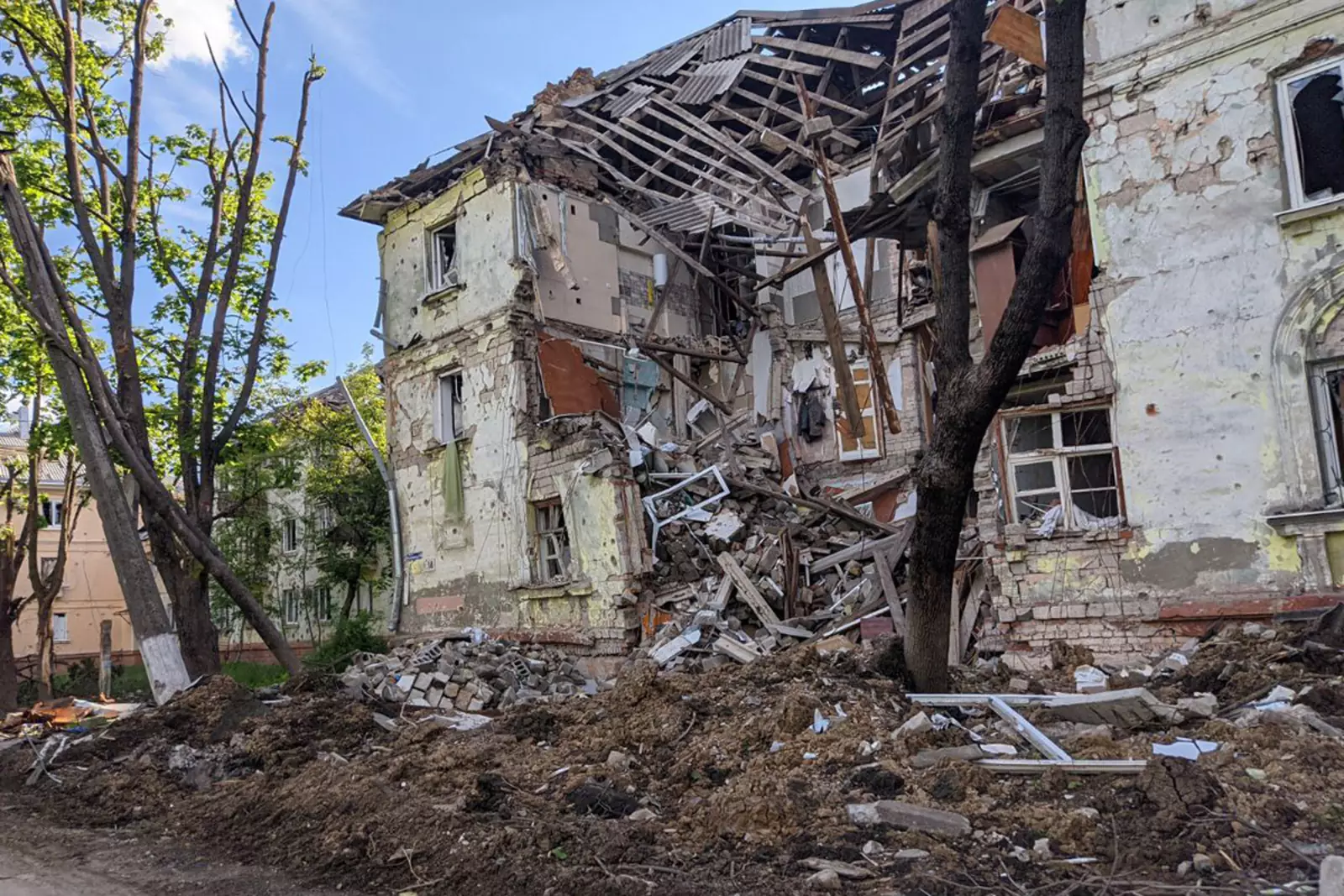 Разрушенные «сталинки» Жовтневого района на фоне металлургического комбината «Азовсталь» (Мариуполь).© Евгений Даманцев