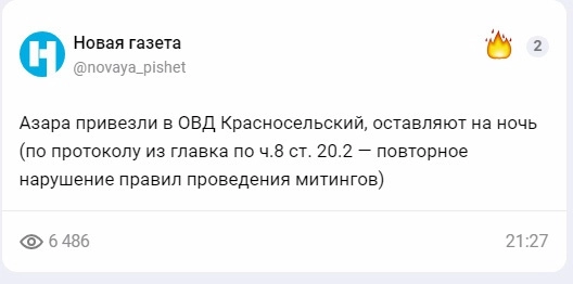 «Новая газета» написала, что Азара привезли в ОВД Красносельский. Его обвиняют по части 8 статьи 20.2 (повторное нарушение правил проведения митингов).