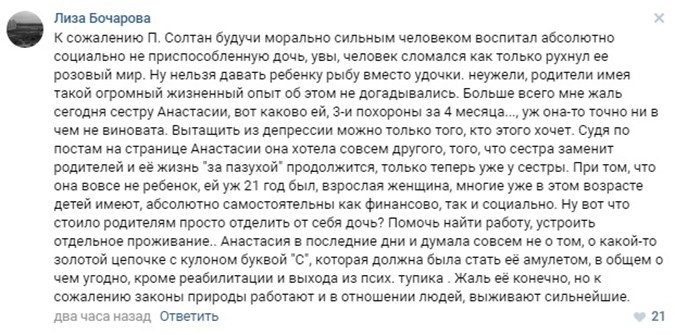 Анастасию Солтан, дочь погибшего вице-спикера Заксобрания Петербурга Павла Солтана, довели до самоубийства душевный кризис, проблемы в семье, а также большое давление общественности, которой всегда интересны подобные драмы. Так считают близкие друзья девушки, которые обсуждают трагедию в социальных сетях. Кроме того, близкие утверждают, что за несколько дней до трагедии Анастасия уже пыталась покончить с собой.