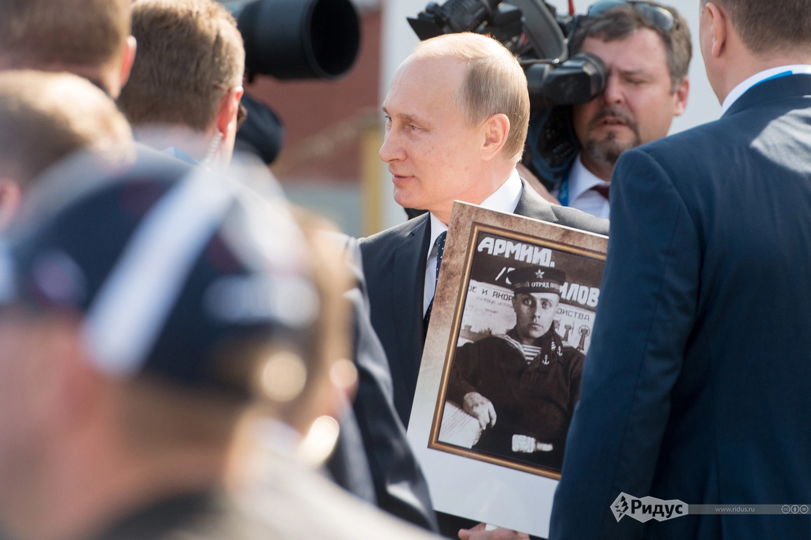 В Москве «Бессмертный полк» собрал более полумиллиона человек. Когда многотысячная колонна вышла на Красную площадь, праздничное шествие возглавил президент России Владимир Путин. Глава государства держал в руках портрет своего отца-фронтовика.